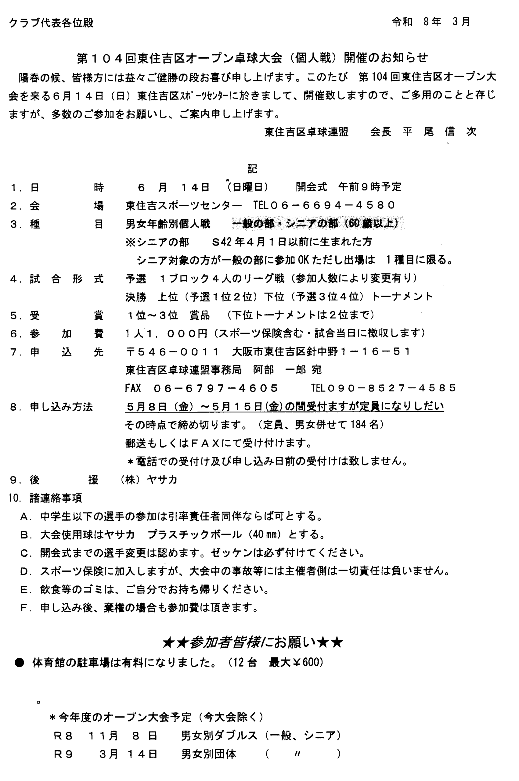 2026年4月3日 / 最終更新日時 : 2026年4月3日 wakasugi 大会予定 第104回東住吉区オープン卓球大会(個人戦)令和8年6月14日(日曜) ◎申し込みは上原宛又は問い合わせページの大会申し込みから申し込みください。 FacebookX コメントを残す コメントをキャンセルメールアドレスが公開されることはありません。 ※ が付いている欄は必須項目ですコメント ※ 名前 ※ メール ※ サイト 次回のコメントで使用するためブラウザーに自分の名前、メールアドレス、サイトを保存する。 上に表示された文字を入力してください。