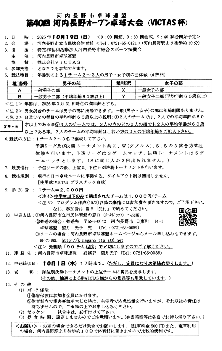 2025年8月31日 / 最終更新日時 : 2025年8月31日 wakasugi 大会予定 第40回 河内長野オープン卓球大会 令和7年10月19日(日) FacebookX コメントを残す コメントをキャンセルメールアドレスが公開されることはありません。 ※ が付いている欄は必須項目ですコメント ※ 名前 ※ メール ※ サイト 次回のコメントで使用するためブラウザーに自分の名前、メールアドレス、サイトを保存する。 上に表示された文字を入力してください。