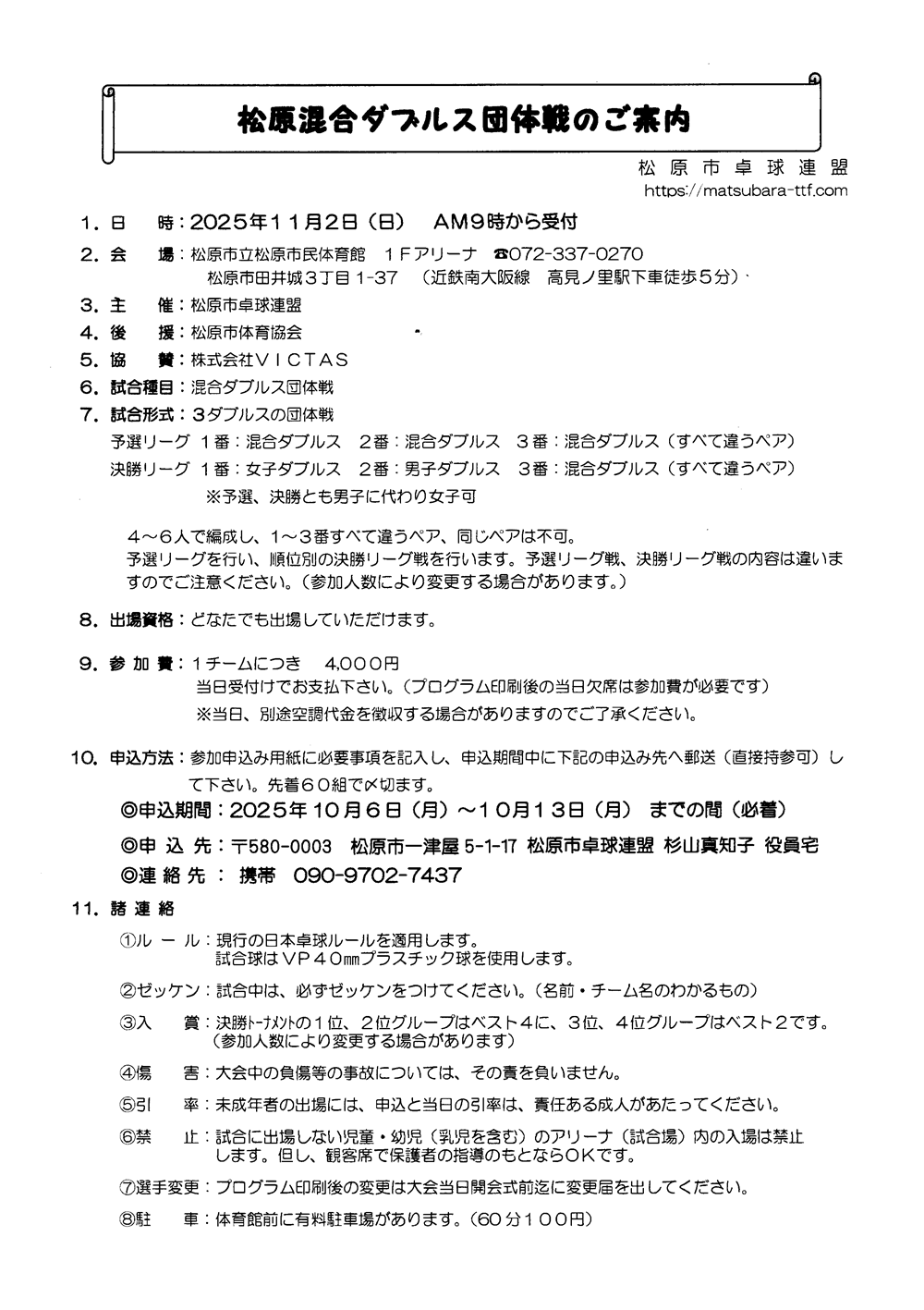 2025年7月6日 / 最終更新日時 : 2025年7月6日 wakasugi 大会予定 松原混合ダブルス団体戦 2025年11月2日 ◎申し込みは上原宛又は問い合わせページの大会申し込みから申し込みください。 FacebookX コメントを残す コメントをキャンセルメールアドレスが公開されることはありません。 ※ が付いている欄は必須項目ですコメント ※ 名前 ※ メール ※ サイト 次回のコメントで使用するためブラウザーに自分の名前、メールアドレス、サイトを保存する。 上に表示された文字を入力してください。